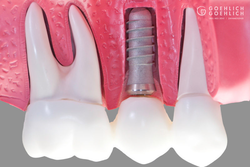 Als Implantat bezeichnet man in der Zahnmedizin eine künstliche Zahnwurzel, die nach Verlust eines eigenen Zahnes als Ersatz eingebracht wird. Das Implantat dient als Basis bzw. Verankerung einer festsitzenden Krone. Geht nur ein Zahn verloren, dient das Implantat zum Schluss der Lücke, ohne dass eine Brücke angefertigt werden muss und dafür die vielleicht intakten Nachbarzähne abgeschliffen werden. Damit schonen wir die umgebenden Zähne. Spätfolgen des Zahnverlustes, wie Kiefergelenkprobleme, Zahnwanderungen oder Karies können vermieden werden. Sind bereits mehrere Zähne verloren gegangen, die nur durch eine Teil- oder Vollprothese ersetzt werden können, ermöglichen wir durch das Einbringen mehrerer Implantate wieder einen festsitzenden Zahnersatz.